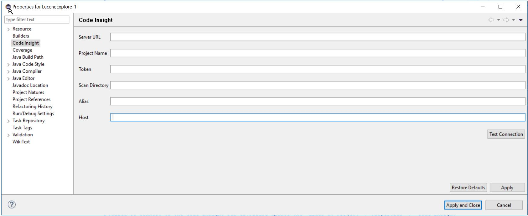 On the Properties window for your project, select Code Insight in the left pane to display the properties needed for a Code Insight scan.