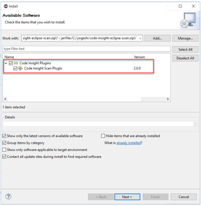 code-insight-eclipse-scan/code-insight-eclipse-scan.zipfile, select it, and click Open. Then click OK.The Available Software window is redisplayed, showing the plugin information you selected.
