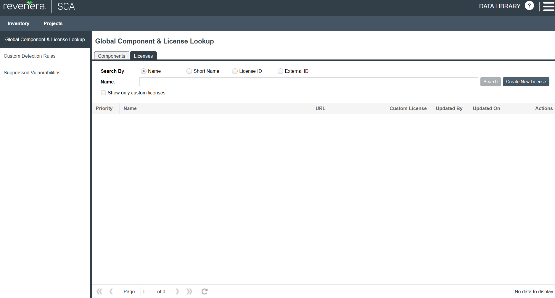 The Global Component & License Lookup > Licenses tab enables users to search for various OSS or third-party licenses that are standard to the Code Insight Data Library or that are custom.